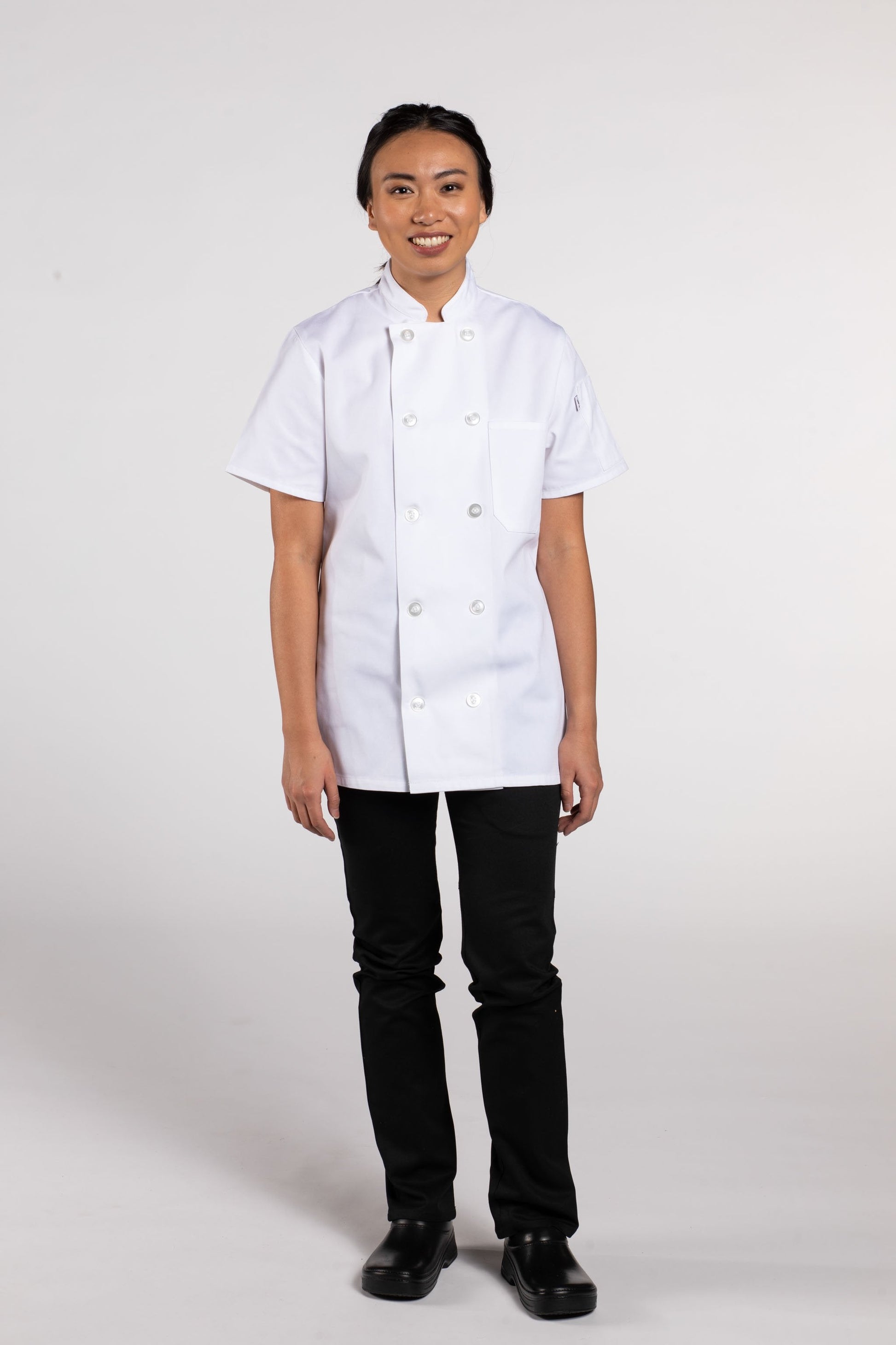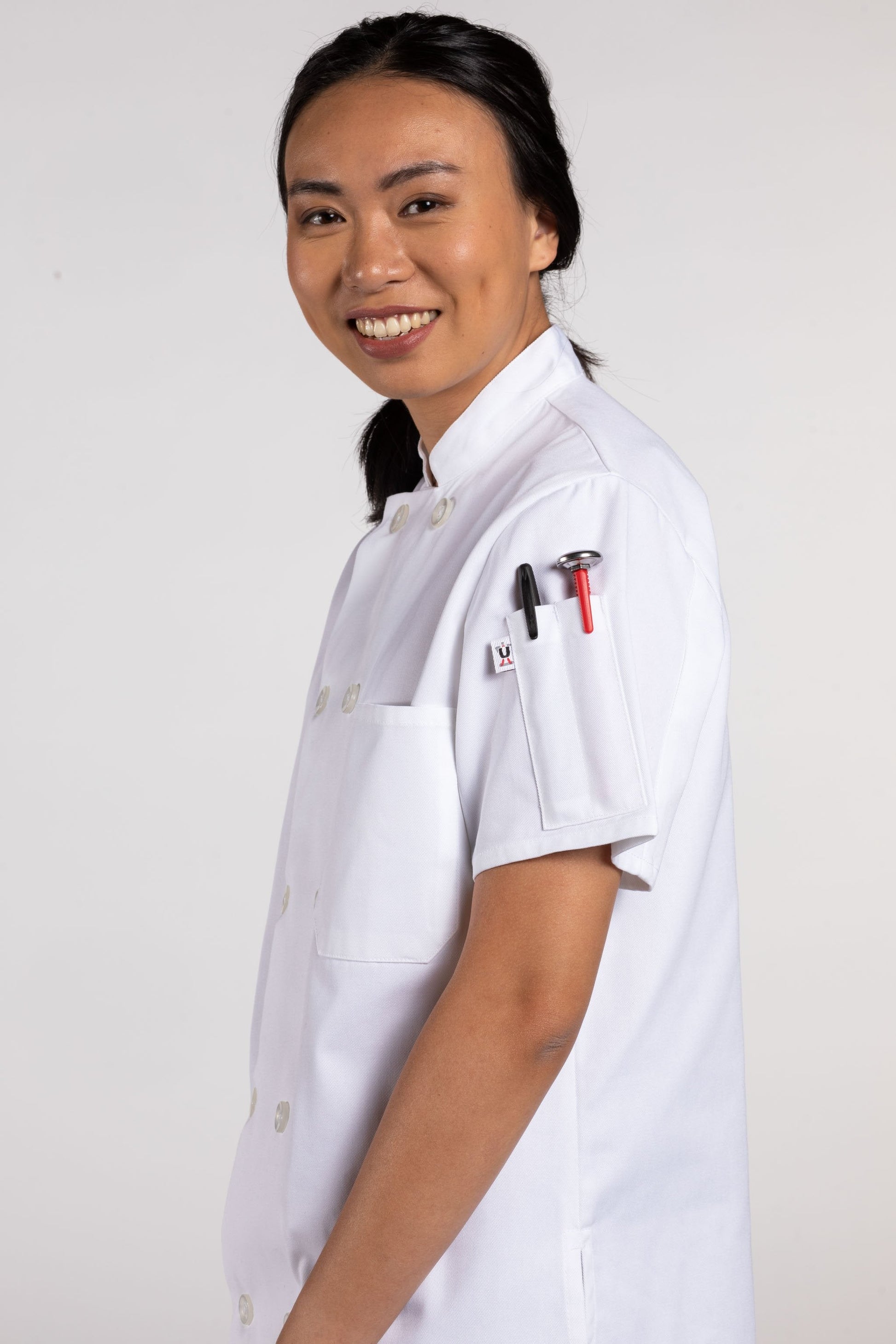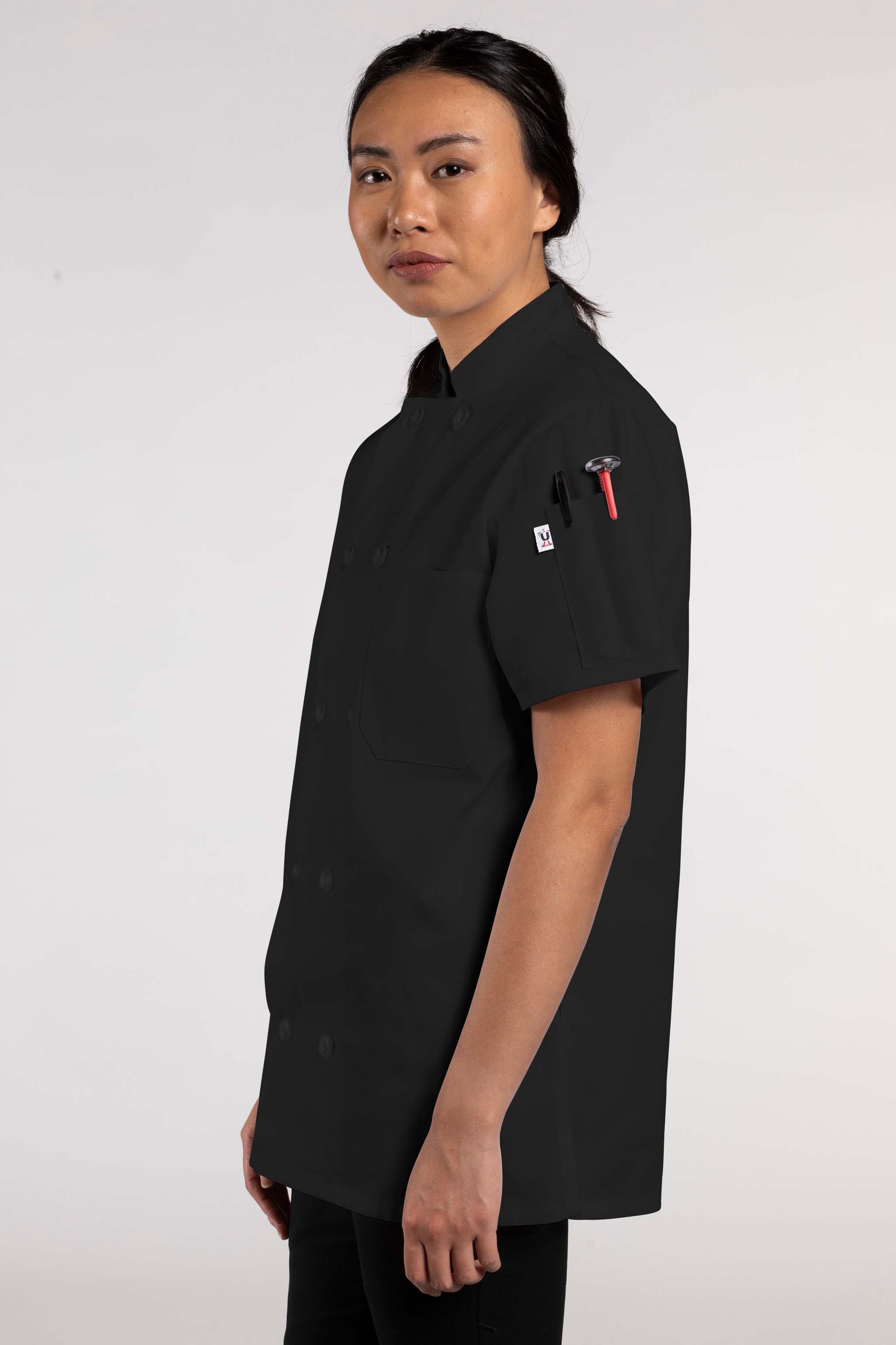 A hard worker like you shouldn’t be restricted by long sleeves and boxy cuts. Our Tahoe Women’s Chef Coat gives you full range of motion thanks to its short-sleeved design and side vents. Suit up with the Tahoe and discover the freedom of a coat built for you.