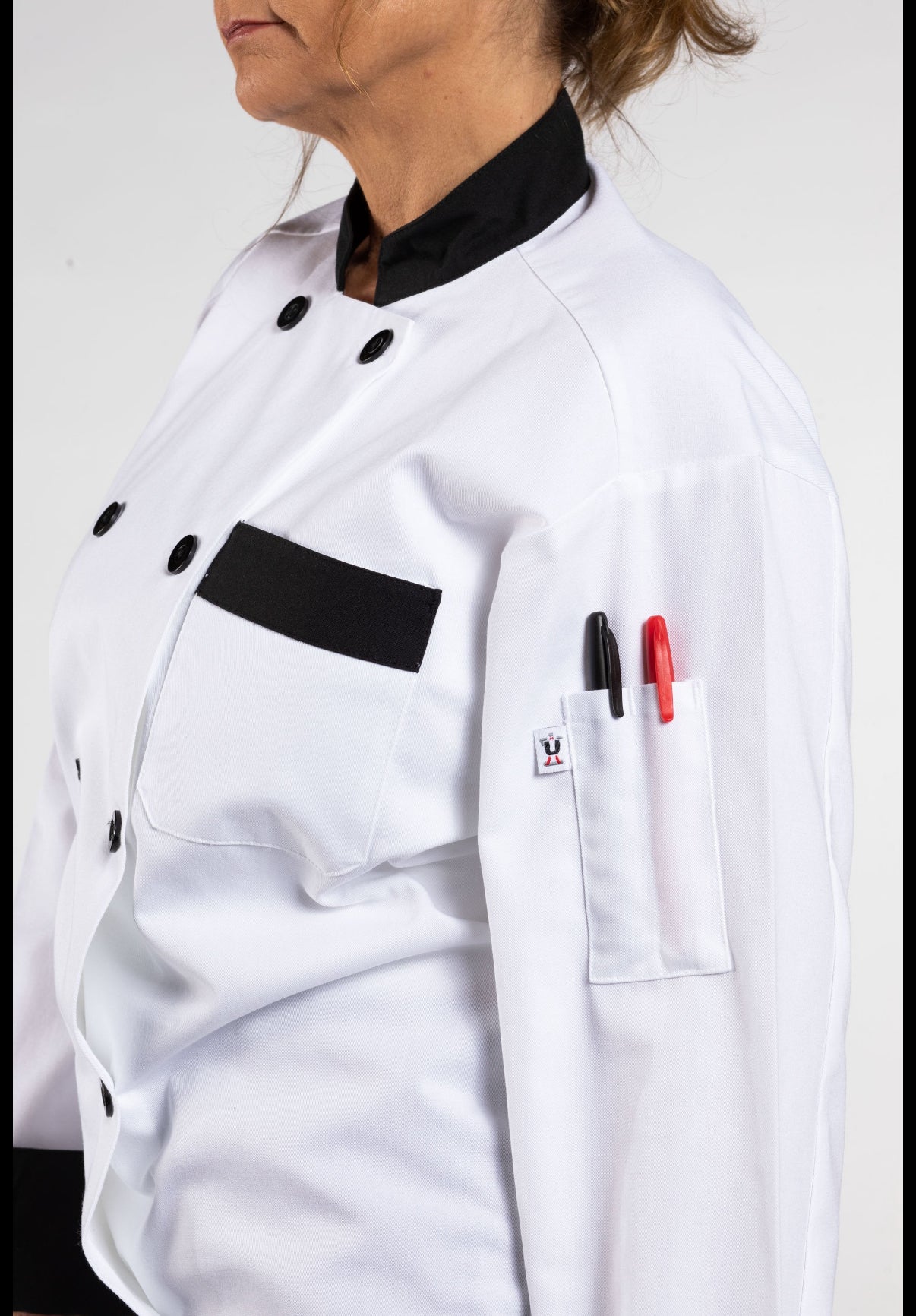 The 212 degree heat of industrial laundry is no match for the Maven. Featuring patented Milliken fabric that's built to last, this stylish chef coat's black trim will keep its color wash after wash and keep you looking sharp.